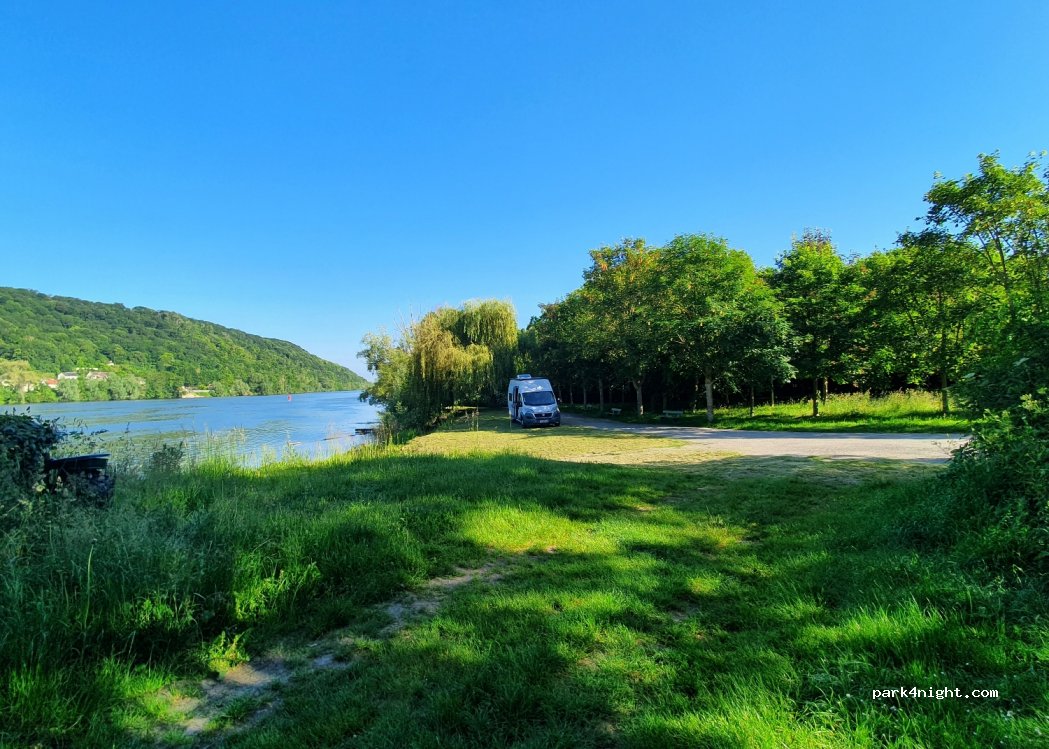 Sehr schön hier mit Blick auf die Seine. Es waren schon 4 Wohnmobile hier aber unser T5 hat noch mit genug Abstand hingepasst. Später kam noch ein fünftes Wohnmobil. 2 hätten zur Not noch hingepasst, dann wäre es aber sehr eng geworden. Von der anderen Seine-Seite etwas laut am Tage (LKW-Verkehr und Bahnstrecke). Nachts ist es okay. 1 Mülltonne ist vorhanden. Keine Beschränkungen.