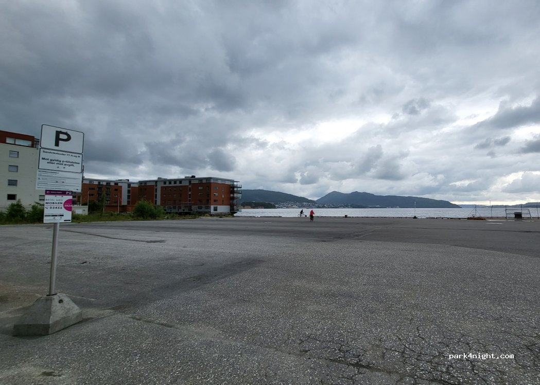 Großer kostenpflichtiger Parkplatz. Dieses wird im Gegensatz zu den anderen von einem anderen Unternehmen betrieben und die App und die Bezahlung sind nahtlos. Bezahlen mit easy park.Kahl und ohne irgendetwas, aber perfekt zum Übernachten und Besuchen der Stadt. Bushaltestelle(Munkebottn) ca 400 m zur Hauptstrasse hoch. Ticket ins Zentrum ( Torget) 40 NOK einfach.