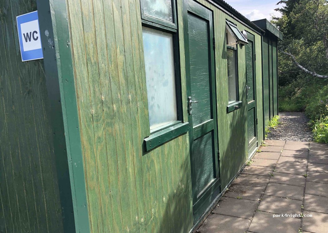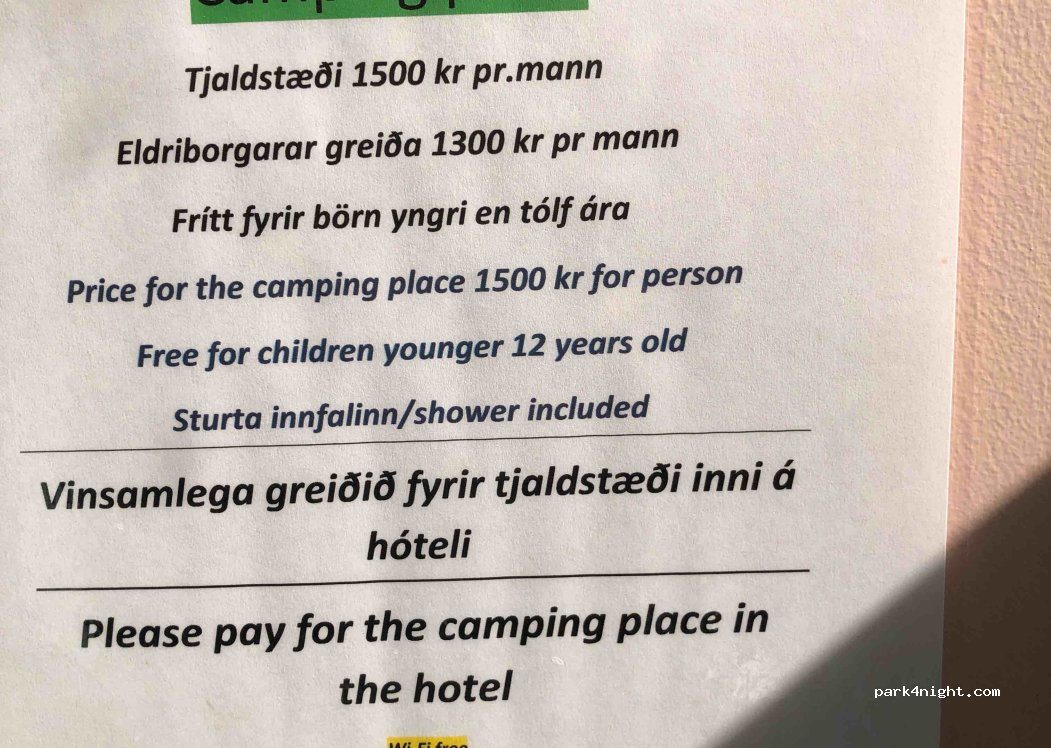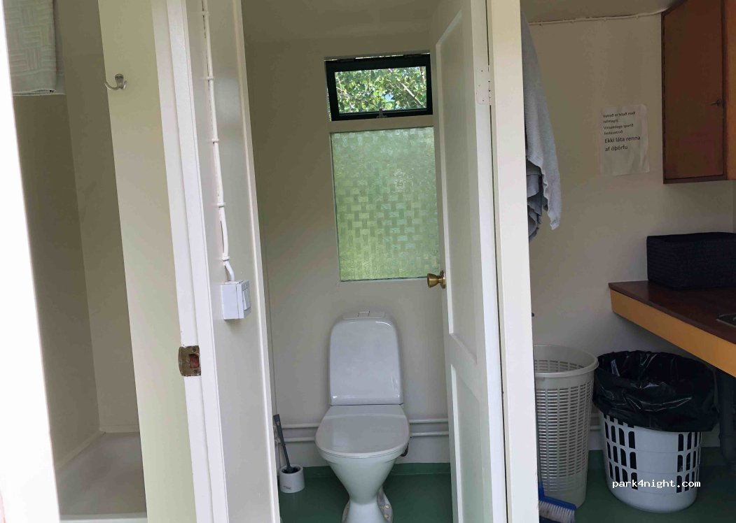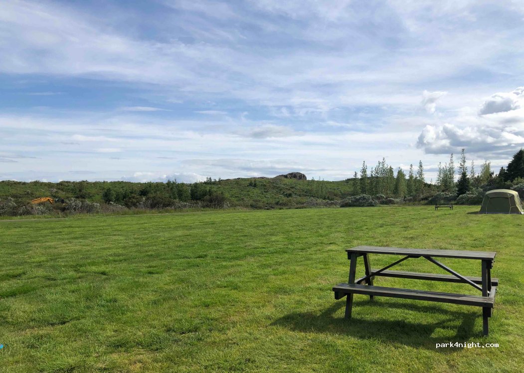 Grand champ très plat entouré d’arbres avec tables pic nique. 3wc, 1douche, lavabos,coin vaisselle Remplissage d’eau pas d’évacuations. Pas d’électricité. Ce lieu est très joli et l’accueil et le paiement se font à l’hôtel Svartiskogur juste à côté. La personne est très sympathique et accueillante. Propreté exemplaire des installations. Calme.
