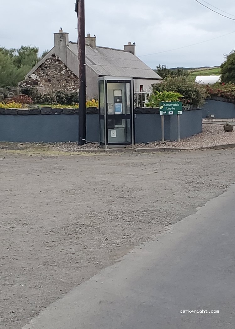 Parking de niveau juste à côté de la Causeway Coastal Way avec vue sur le magnifique littoral. Poubelle pour déchets résiduels sur place. Les chutes de Dunseverick sont à 2 minutes à pied. Le cul-de-sac mène au port de Dunseverick pour les recharges d'eau douce et les toilettes. Le camping est interdit ici.