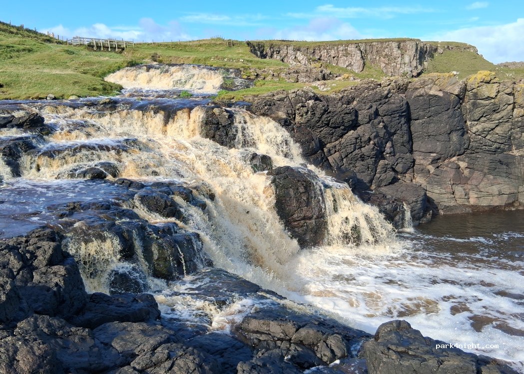 trouvé une place ici rapidement en attendant qu'une voiture parte. d'ici, accès aux cascades et château par le sentier côtier. pas passé la nuit