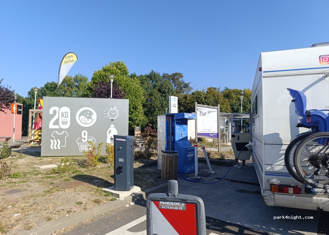 attention l'aire de service pour camping car est côté parking voiture. pas d'eau propre qui coule, le robinet d'eau propre trempe dans le trou pour vider les toilettes. pas d'eau non plus pour nettoyer votre cassette. vous pouvez juste vider vos eaux usées. c'est lamentable
