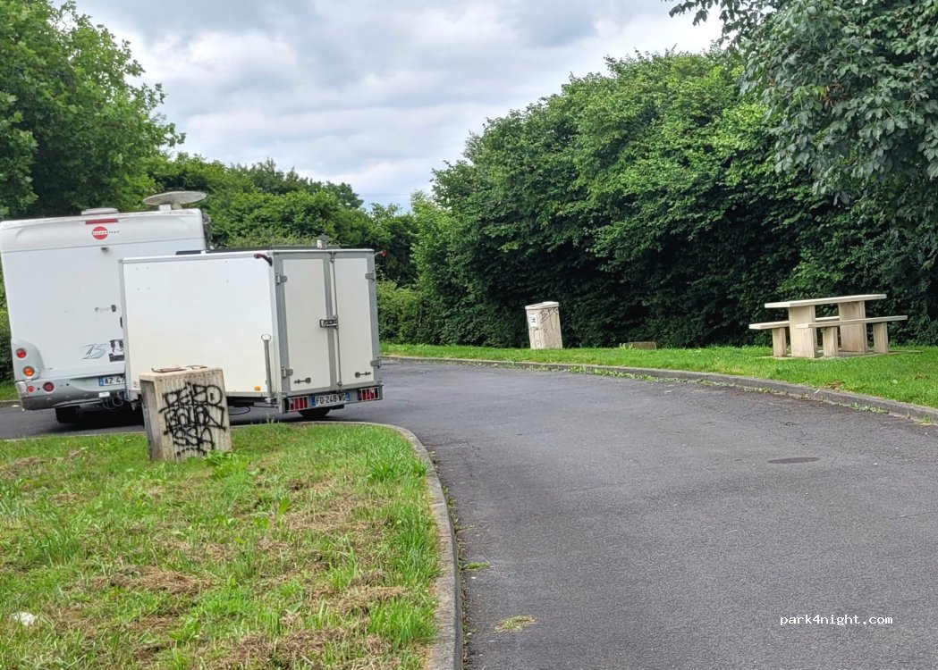 Aire de pique-nique, 2 tables et bancs en dur avec poubelles.. Possibilité de garer un camping-car pour la nuit
