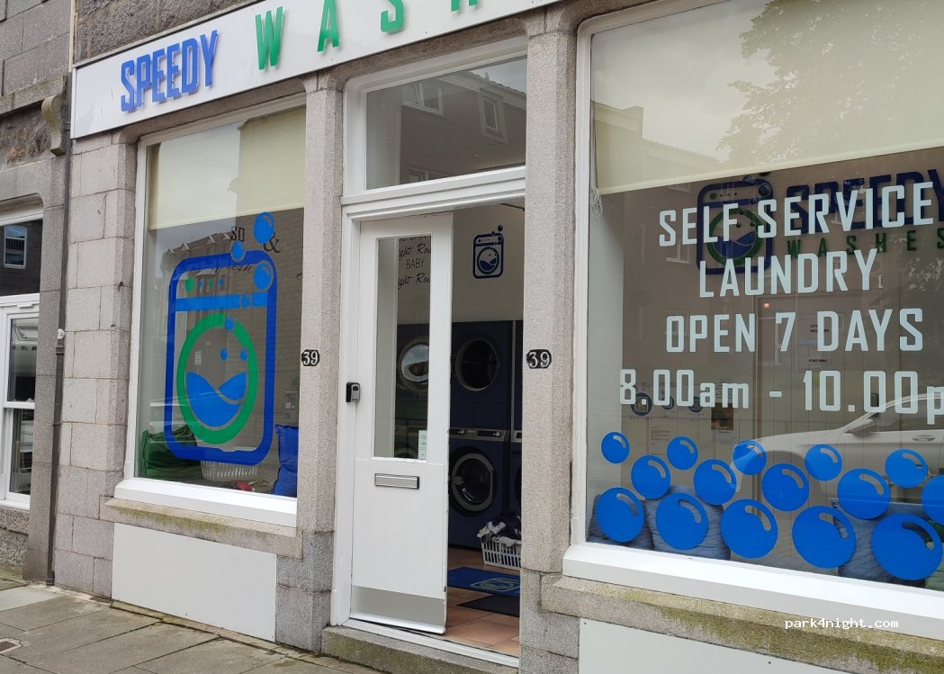 Selbstbedienungswäscherei, sehr sauber. 3 Waschmaschinen und 3 Trockner. sehr sauber. Sie müssen Ihr eigenes Waschmittel und Weichspüler mitbringen oder können es direkt hier kaufen (1x Capsule 50p). Der Weg dorthin ist breit, wir sind mit unserem 7m langen Laika Ecovip dorthin gefahren