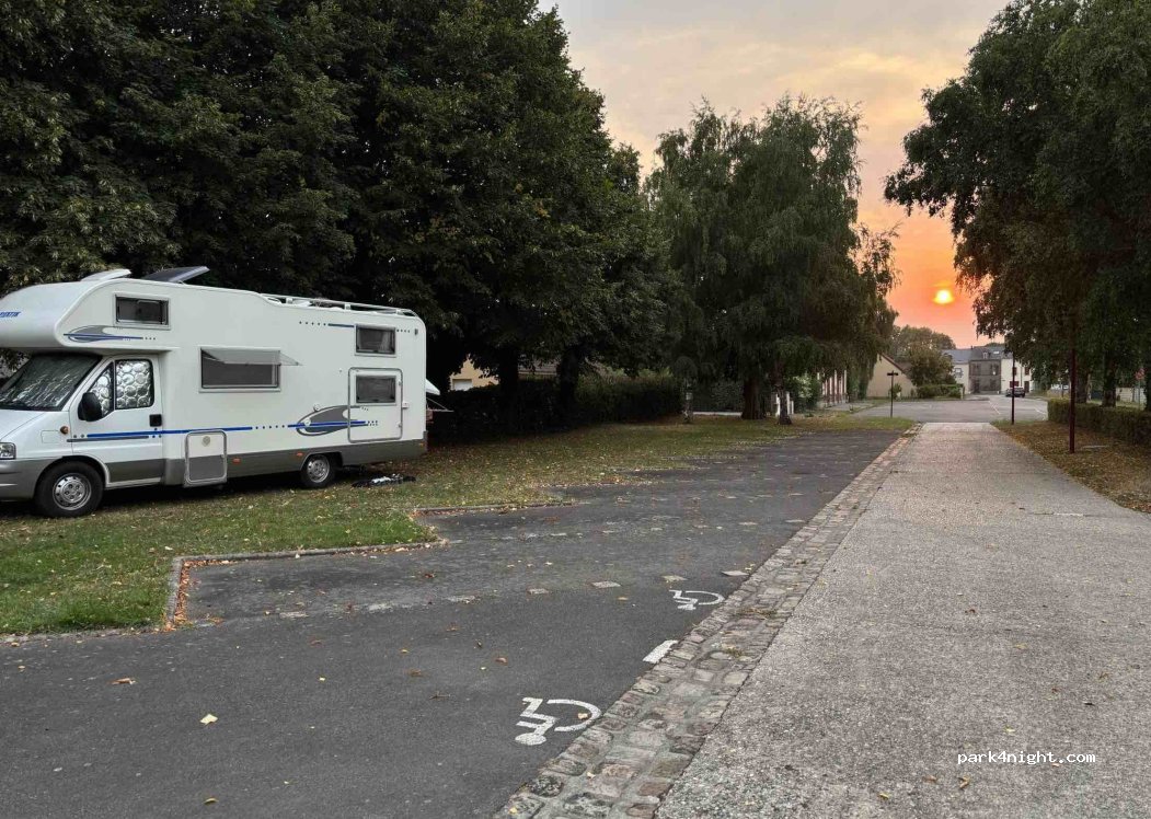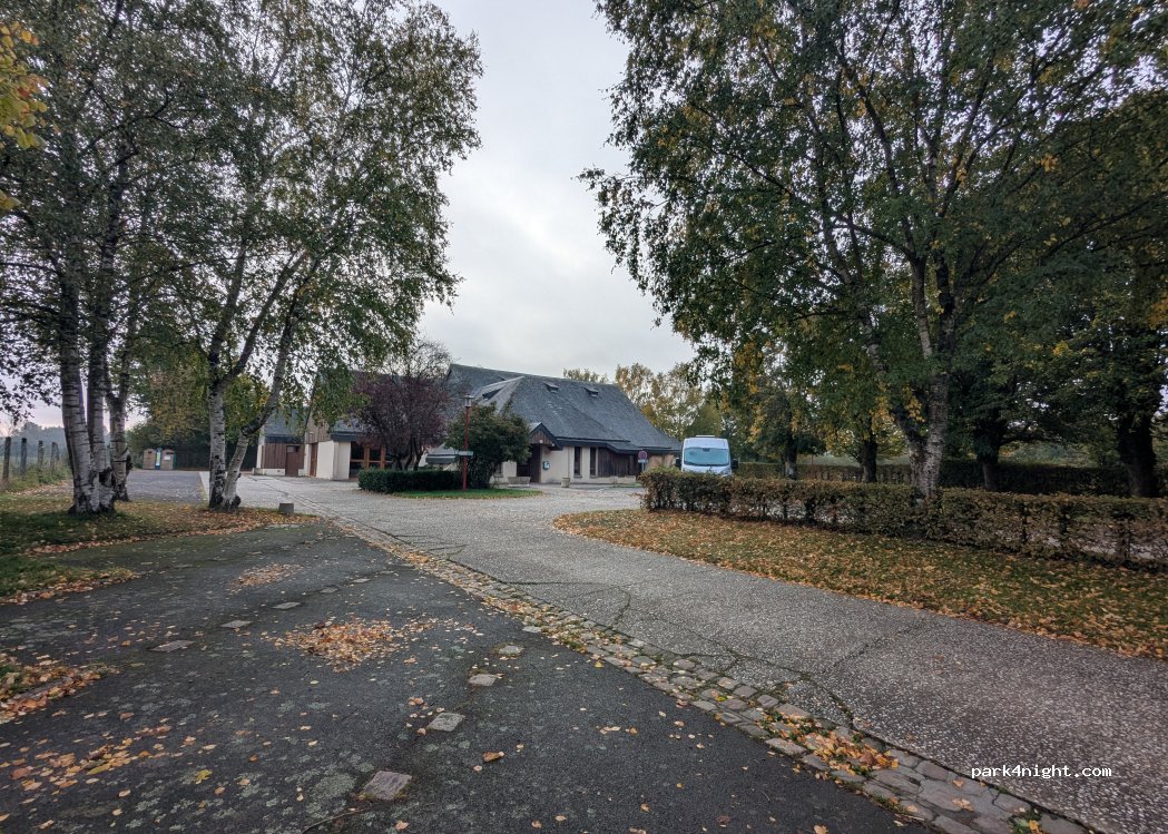 On y a très bien dormi en Octobre, sur le dur et pas sous les arbres à cause de la pluie, donc bien l'hiver aussi. Parking de la voie verte juste derrière si jamais la salle est occupée. Balades sympa avec chien. Pharmacie juste à côté (ancienne gare). Toilettes sur l'aire de vidange.