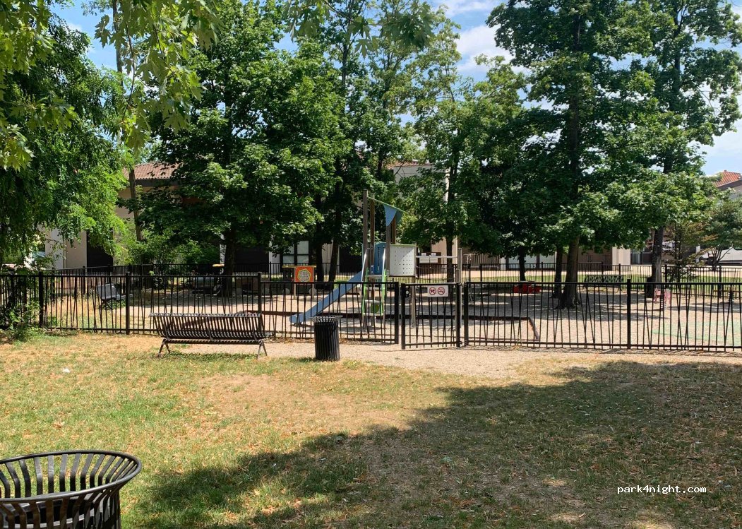 Pretty wooded park with a few tables, benches, games for children. Calme. Parking all around