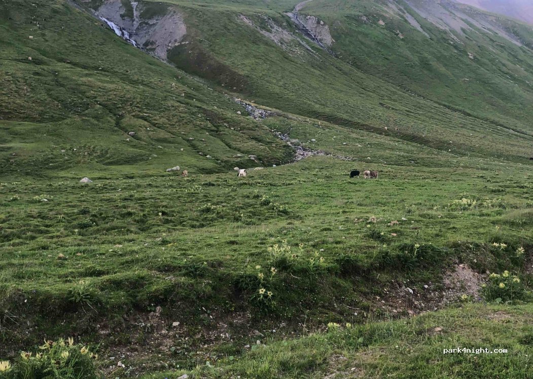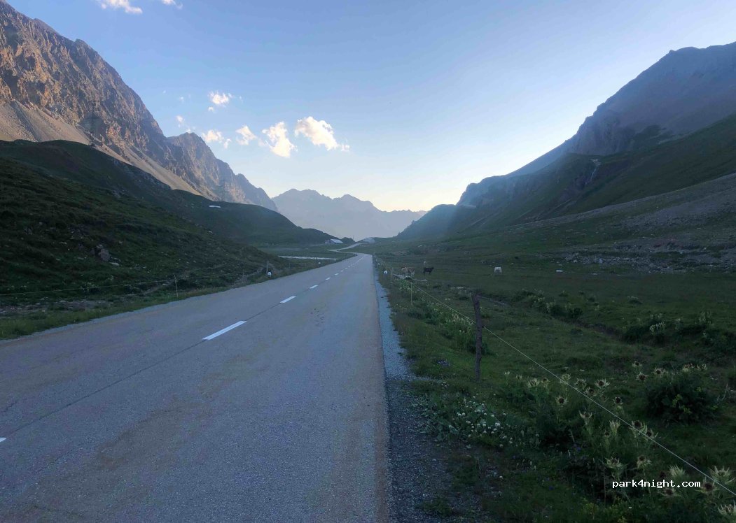 On the side of the road. Place for two motorhomes. Mountain view and cows are all around. It's very nice. Correct land, almost level. Camping and overnight stays prohibited.