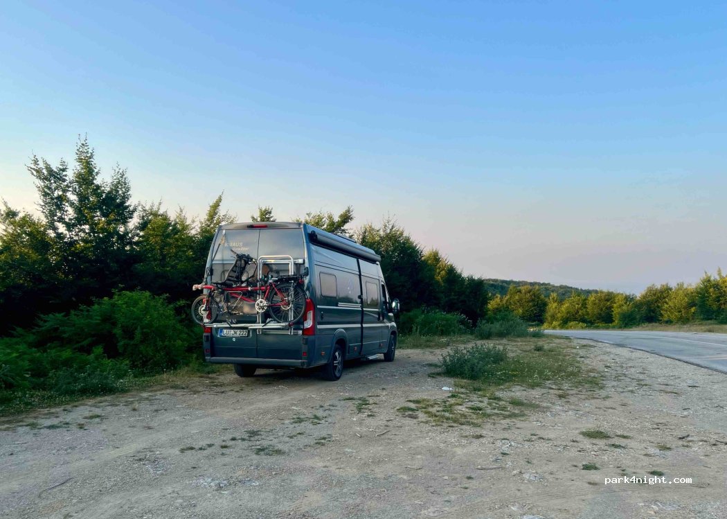 Recht ebene und wenig vermüllte Parkbucht auf den kühlen Höhen, wenig Verkehr auf der guten Panoramastraße R-206.