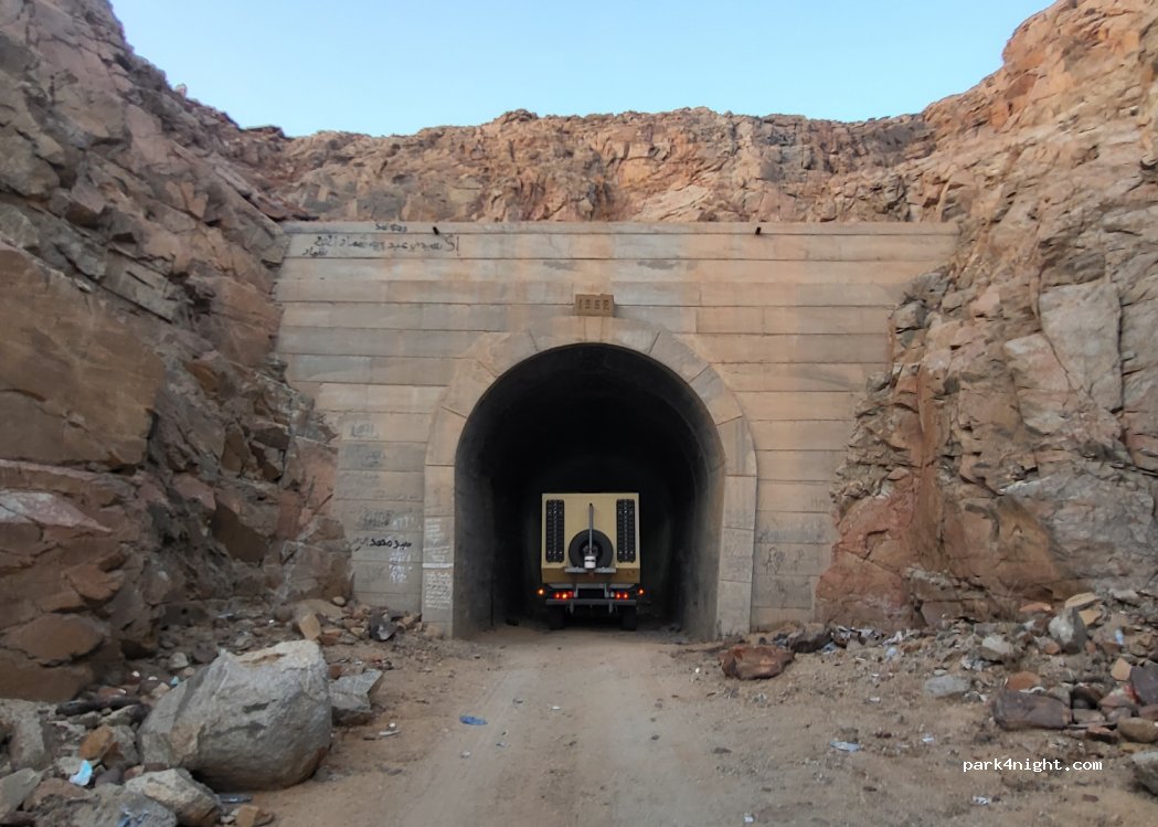 Die Eisenbahnschienen sind demontiert und man kann im Tunnel kühl und schattig parken.
