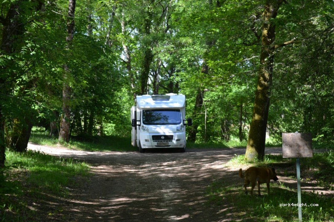 Petit parking de 4/5 véhicules, accès par petit chemin en terre. En pleine nature et très calme. A côté des ruines de l'abbaye de Boschaud de style cistercien mais avec voûte en coupoles.