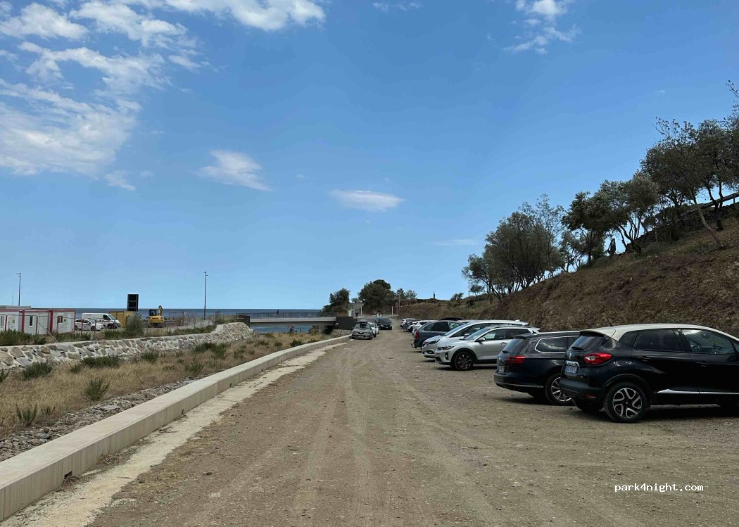 Großer Parkplatz neben einem schönen Strand, Parken in Reihen und entlang der Mauer, Parken mit einem langen Fahrzeug möglich, 20 Minuten kostenlos.