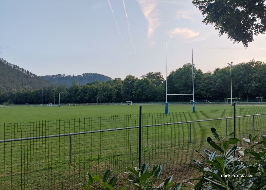 Parking à proximité d'un skatepark, d'une aire de jeux et d'équipements sportifs, terrain de sport.