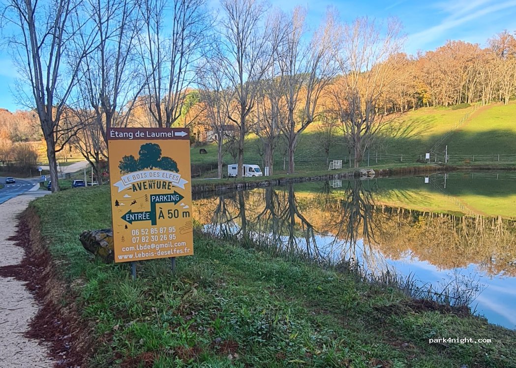 Parking sans limitation de hauteur, ombragé, à l'entrée d'un parking et d'une route du bord de lac qui sont eux limités en hauteur. Lac de baignade gratuit à côté, avec eau, toilettes, douche froide extérieure, et accrobranche (en tout cas en été).