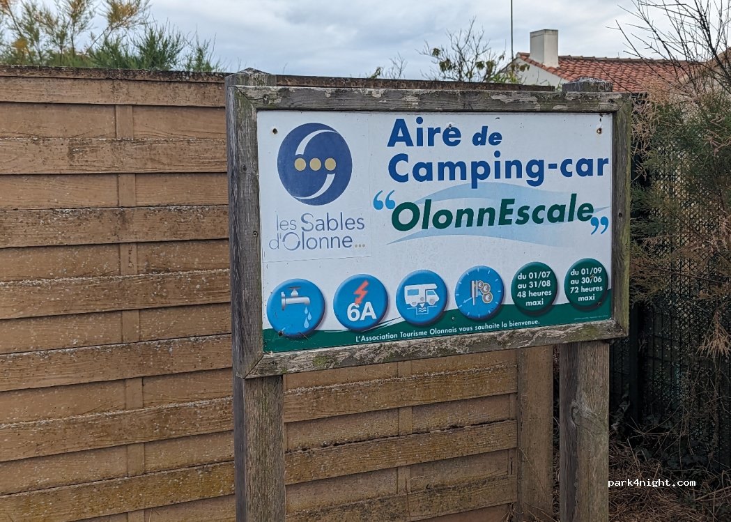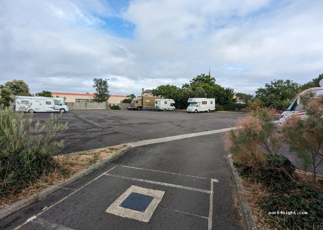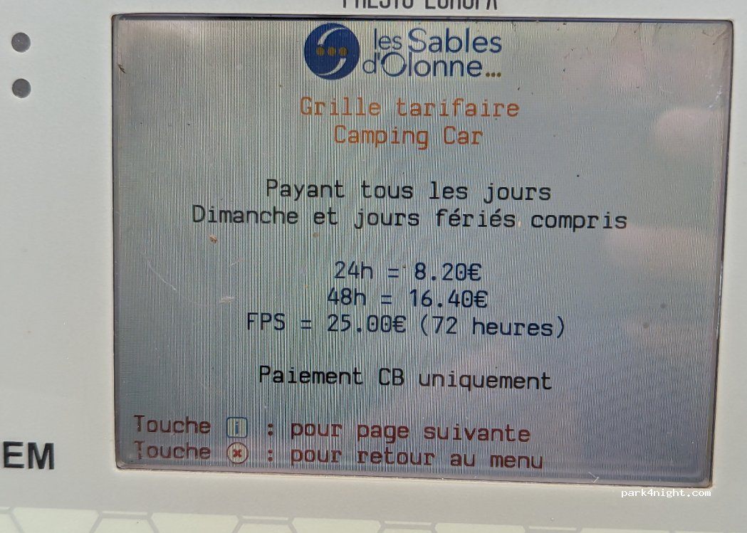 aire très agréable, sur goudron 1 peu ombragée,prix très raisonnable. bus á100m pour se rendre au centre des sables d’olone (1.5€)
