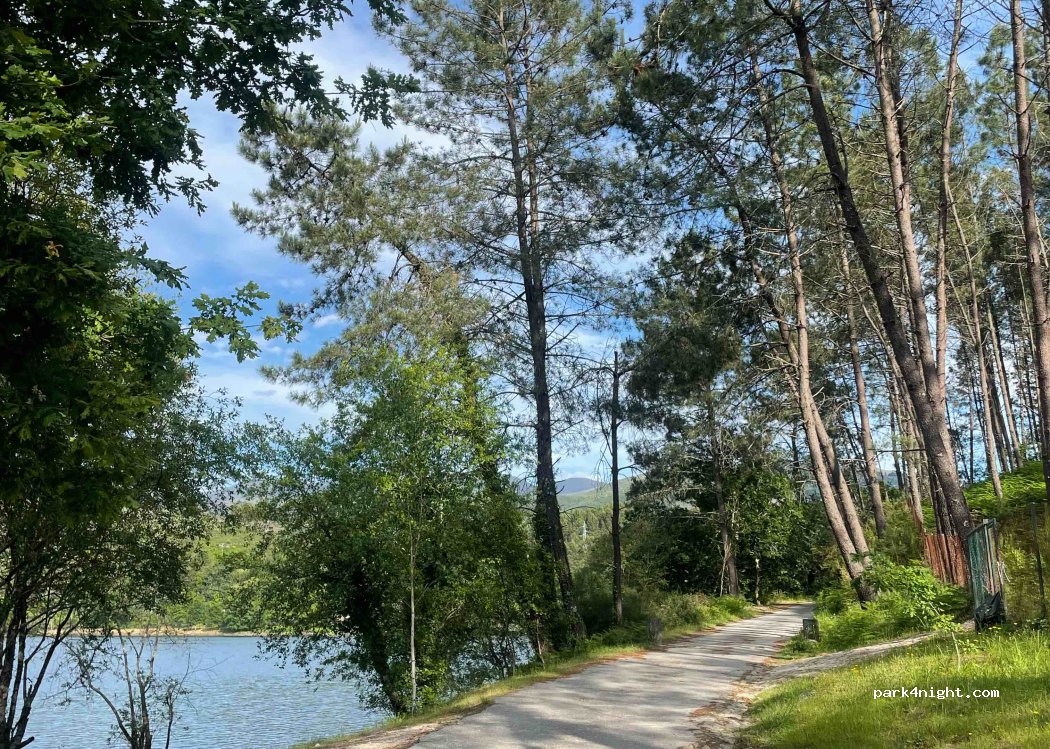 Small quiet corner by the Lima river. Perfect place to swim; it lies on part of the old national road that was submerged when Lindoso dam was built. It’s a reservoir so it’s perfect to swim and to fish(with a permit), the water is not that cold. Although it seems hard to turn around you car/camper, there’s a little space to do it, just take a look around. if you need something from bar/small grocery, there’s in camping site (you just have to go around).
