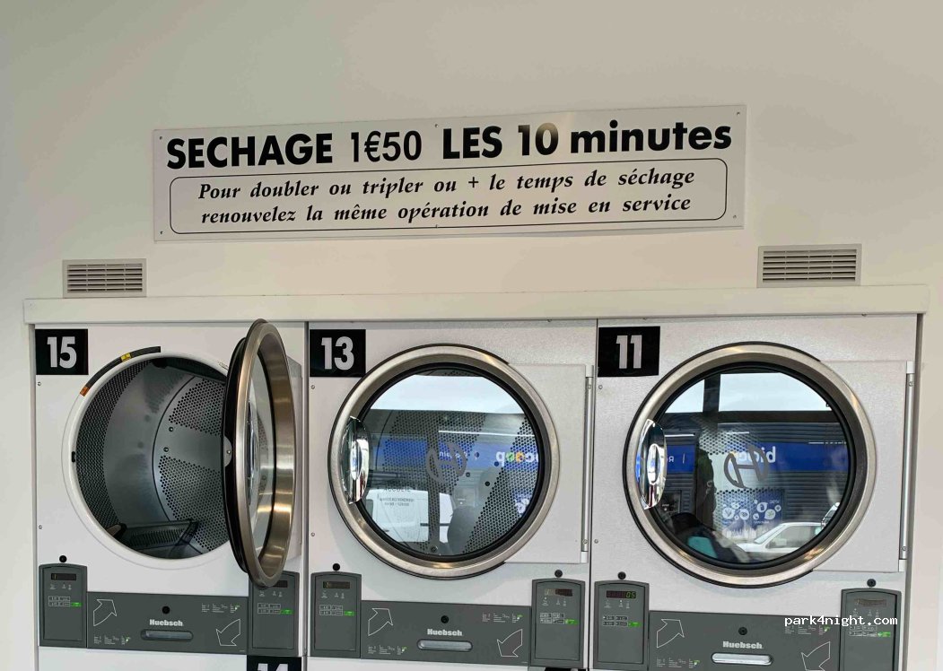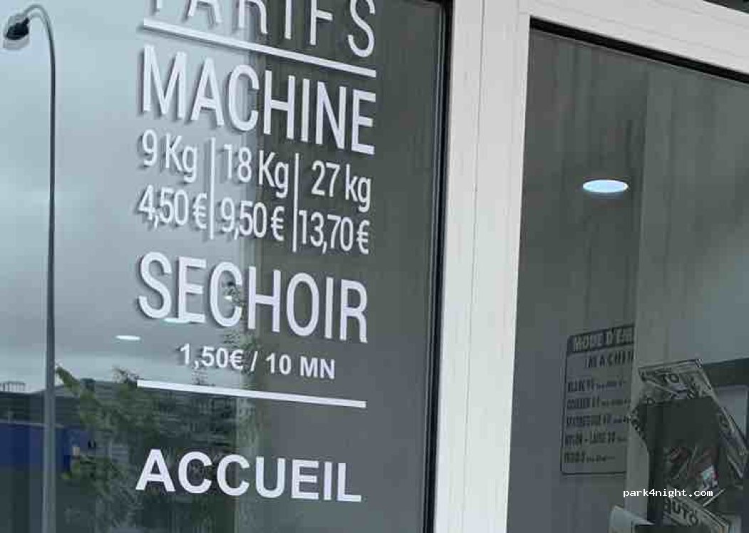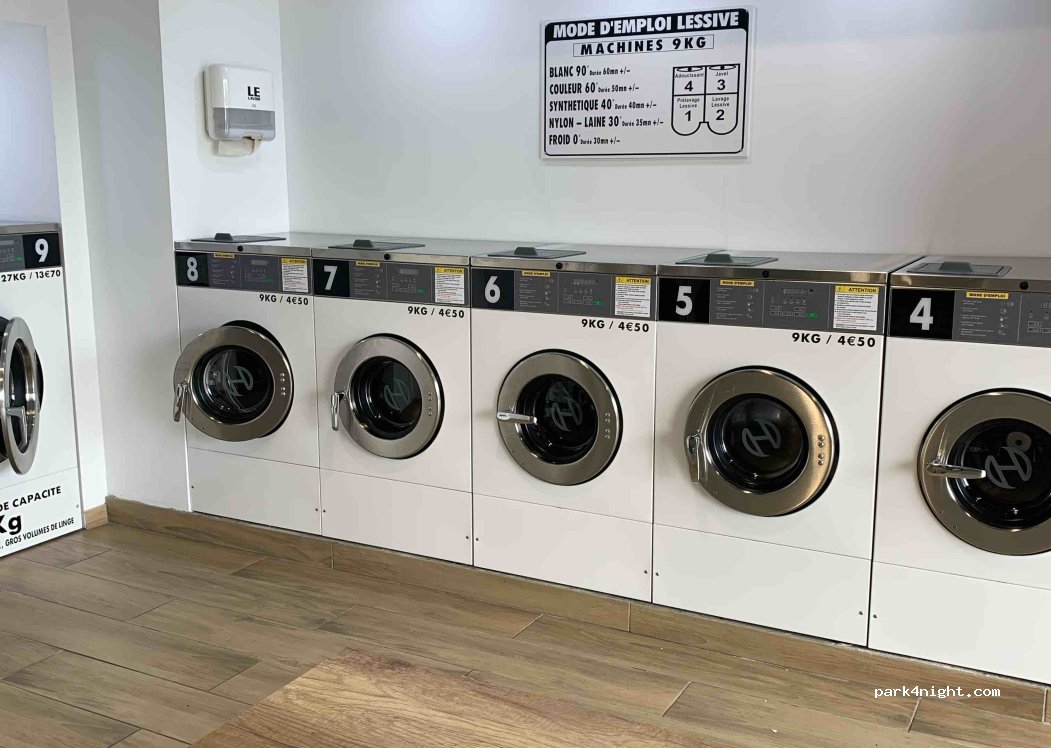 Tout est bien entretenu. Il y a le choix de machines à laver de 9kg jusqu'à 27kg. Les prix de 4.5€ à 13.70€. Sèche-linge 10mn 1.5€ Nous avons pu nous garer devant avec notre camping-car de 7m car il n'y avait pas trop de monde ce dimanche. C'est une zone commerciale.