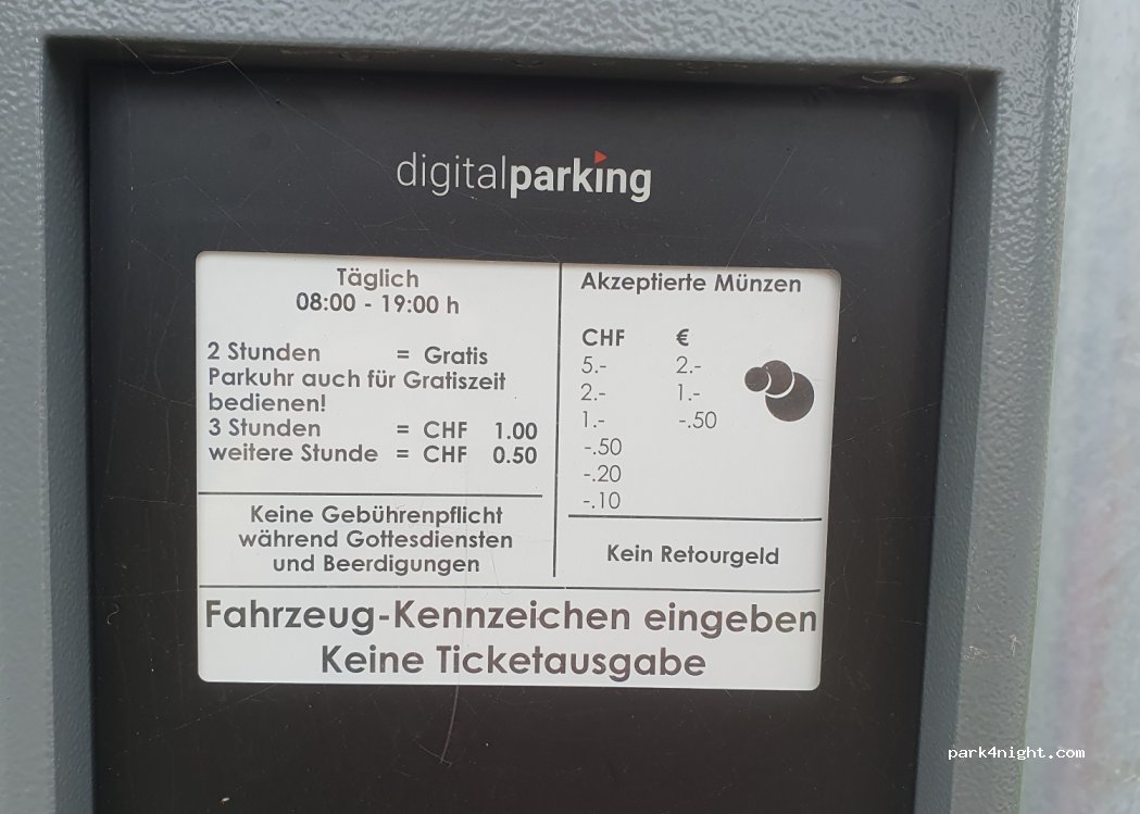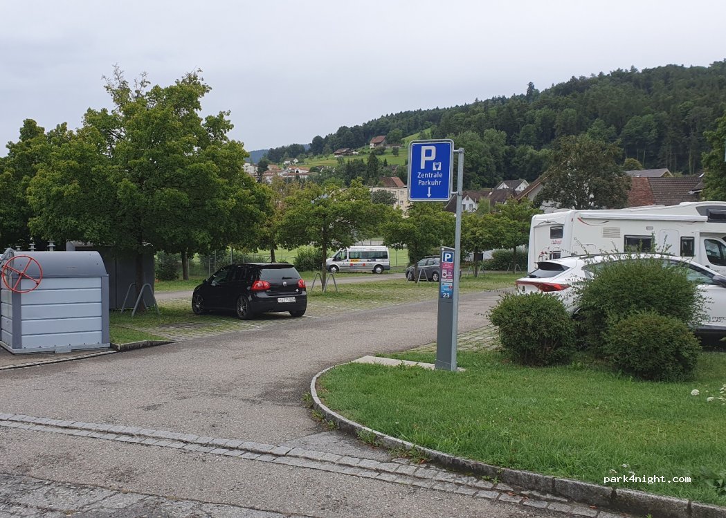 Geräumiger P mit Entsorgungsmöglichkeit (Restmüll, Metall, Glas etc), von 19 bis 8 Uhr kostenfrei.