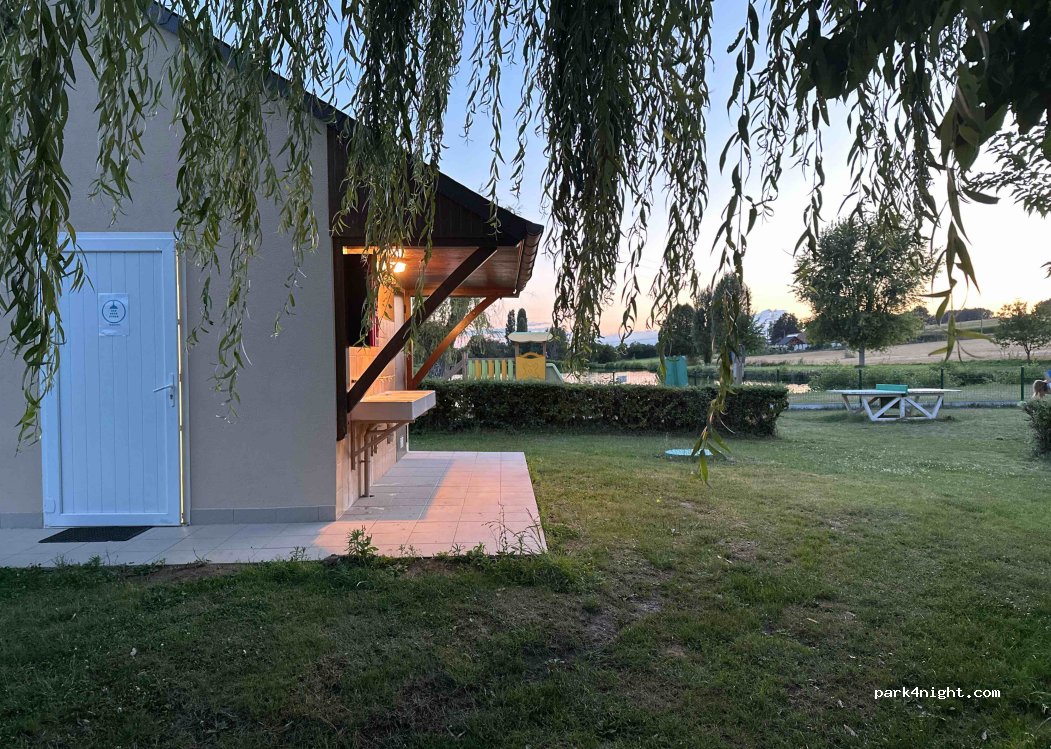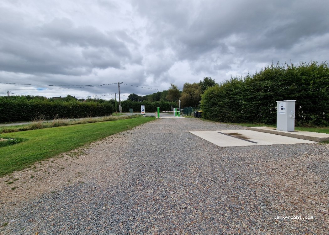 Air avec barrière camping car park, possibilité d'arriver a toutes heures. Services eau propre, eau grise, électricité, petit air de jeux pour les enfants et étang. douche fermé à cette période. 13.76 euros pour 1 nuit.