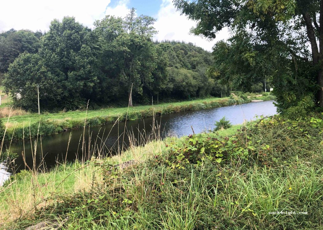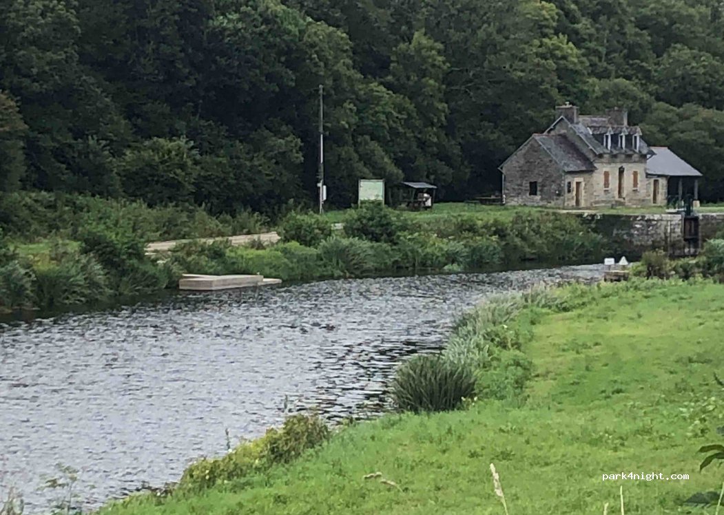 Très bon parking de jour. Il y a beaucoup de circulation. Il y a possibilité de dormir mais ça reste bruyant. Près de chemin de randonnée, le long du canal de Nantes à Brest. Il y a la 4 G. Pas d’électricité, ni de service.