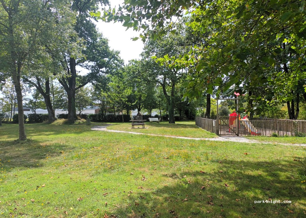 Jardin du Galitour, stationnement sans restriction de hauteur. Tables de pique-nique, bancs, aire de jeux.
