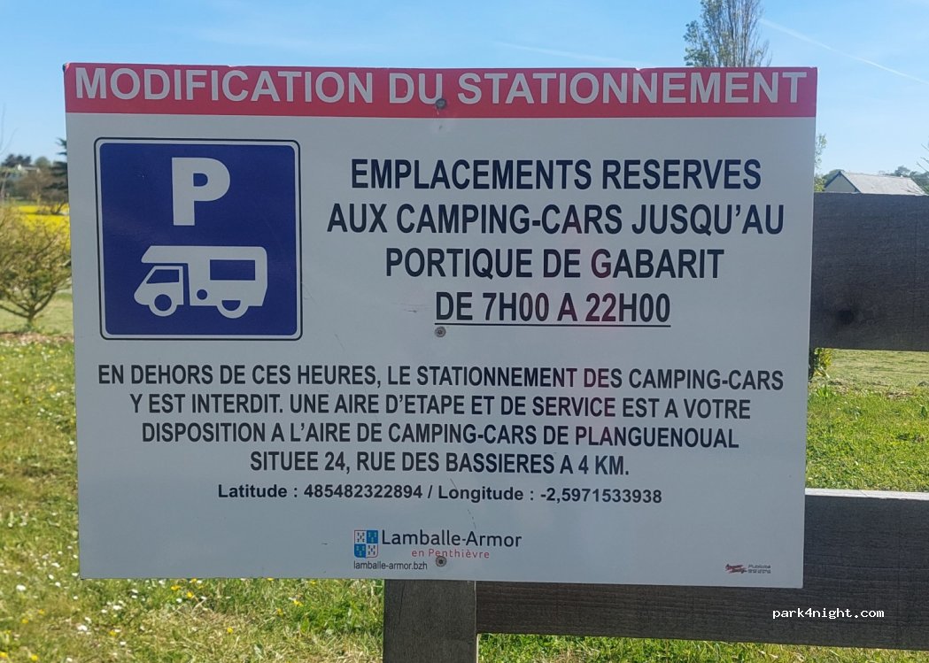il y a un panneau à l'entrée du parking annonçant une modification des règles de stationnements, interdit de 20h à 7h. C'est un panneau qui vient d'être installé, merci de donner suite . Sinon, lieu parfait pour une halte en journée.