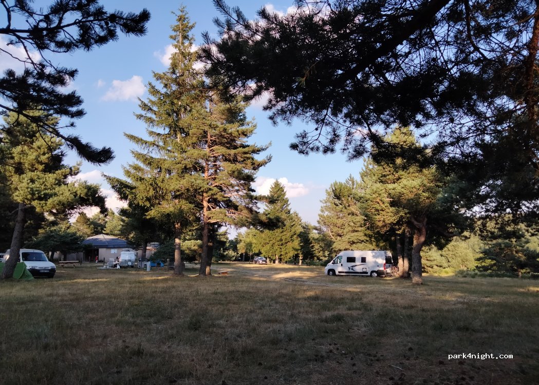 De grands espaces, du calme, de la fraîcheur en altitude et à l'ombre des pins. Cette aire naturelle est magnifique et peu fréquentée... Sanitaires simples mais propres. Un chemin descend directement au village où il y a bars, restos et surtout une supérette où l'on trouve de tout et où l'accueil est très sympathique. Bravo et merci à la commune d'où partent de nombreux chemins de randonnée.