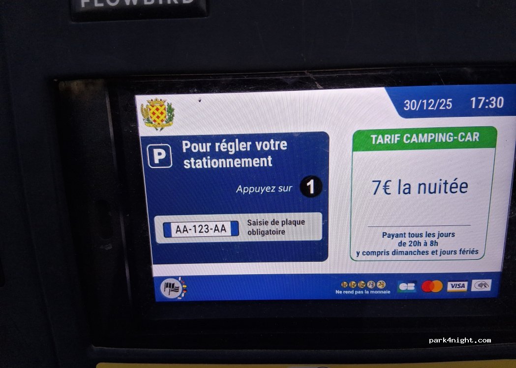 7 euros en liquide ? sans reçu ? où va l'argent ? On peu se poser la question... Perso je n'avais pas de liquide, j'ai donc payée par chèque, et bien rajoutée l'ordre " trésor public " même si cela ne l'arrangeait pas ...selon ses dires.. De plus, Pour une nuit sans aucun services .... 7 euros c'est exagéré je trouve...au delà du fait que les voitures se gare aussi sur cette aire...
