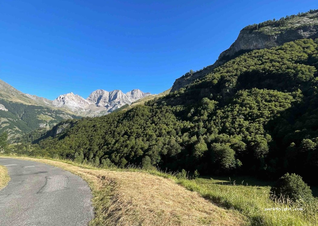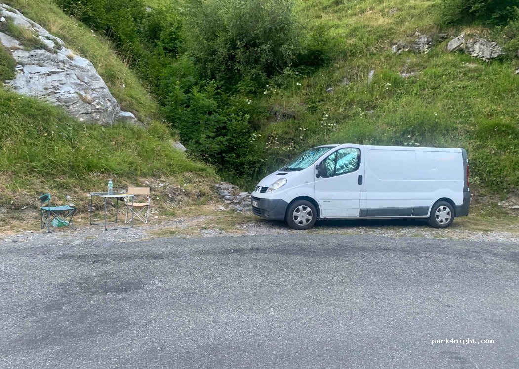 Pitch for van or small motorhome by the roadside with very little traffic! 5 minutes from Gavarnie. Exceptional view of the circus! River below. Slightly sloping though.