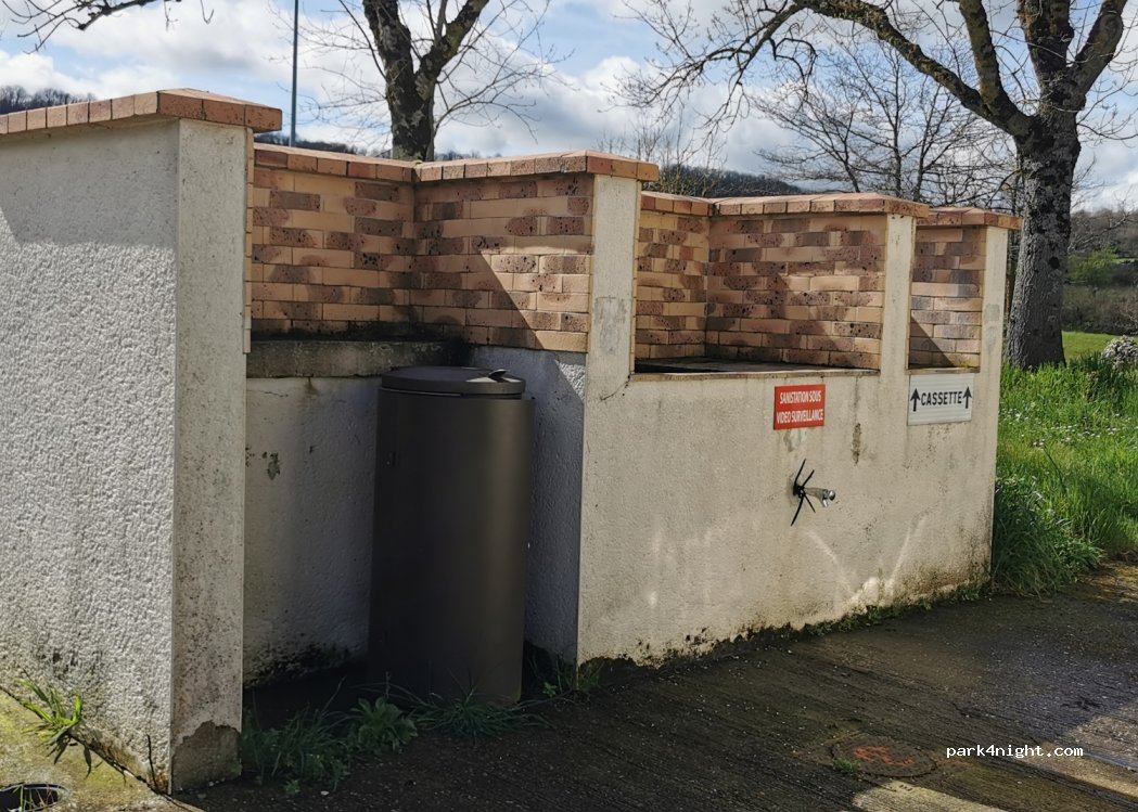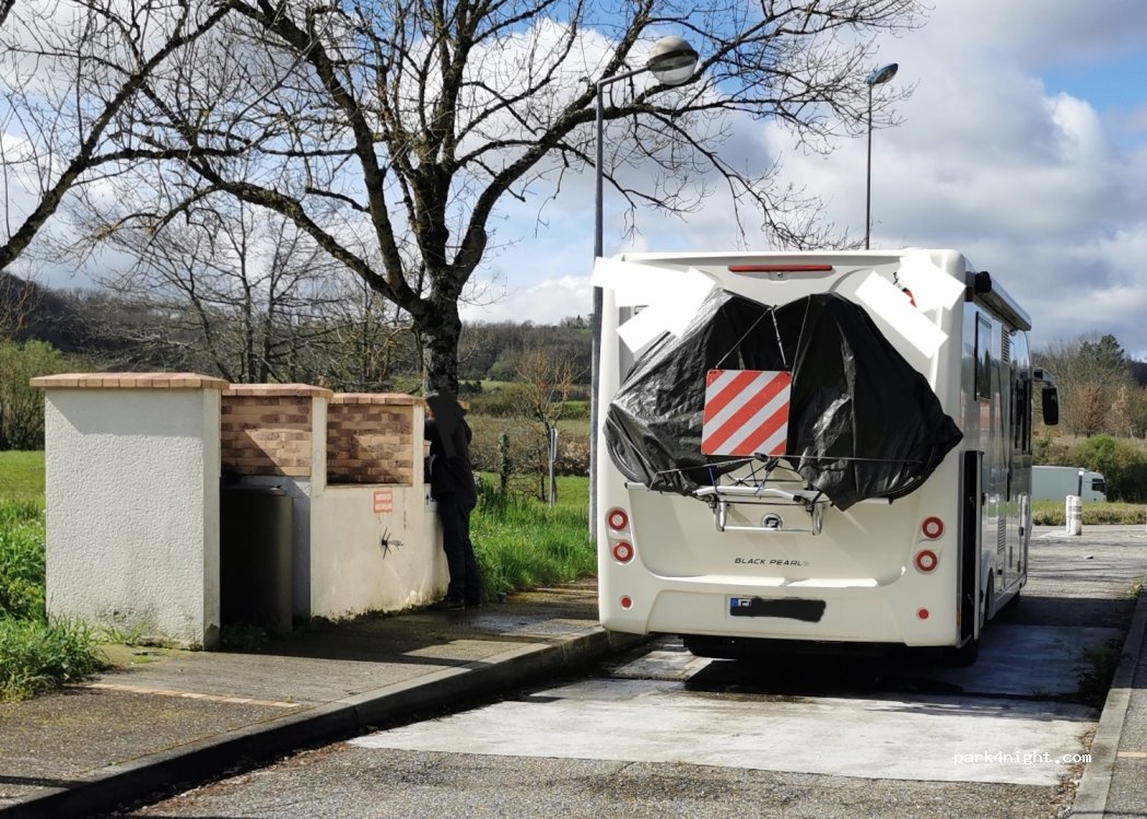 Services camping car, face au parking poids lourd en allant vers la sortie A62 Pratique tout y est, vidange gris, noir et eau propre avec bouton poussoir. Je n'ai pas dormi sur le parking.