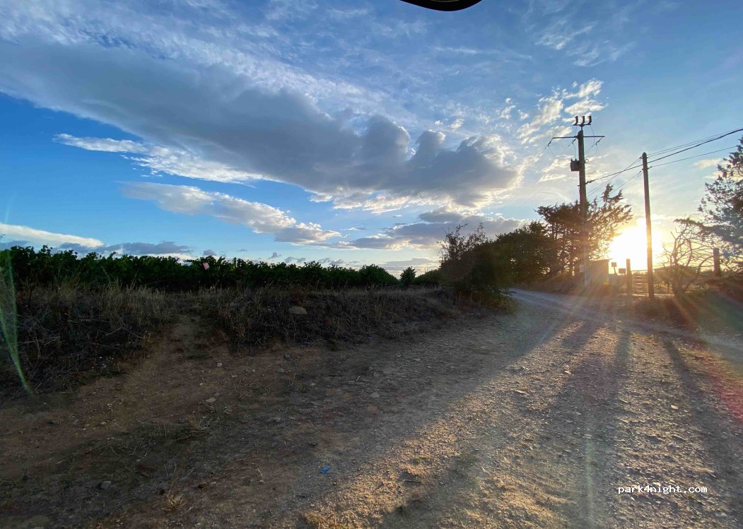 Direkt am Feldweg der Häuser, leider sehr schmutzig. Definitiv kein 5 Sterne Platz. An Olivenbäumen fährt man vorbei, sind hier aber nicht in Sicht.
