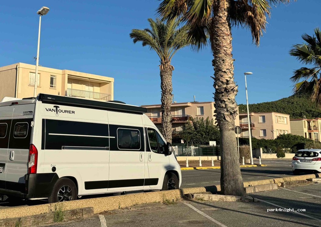 Sehr schöner Platz, abends Sonnenuntergang und morgens Sonnenaufgang. Schöner Strand, Toilette vorhanden fußläufig Bäcker kleine Restaurants und kleiner Hafen. Strandbars schon geschlossen, alles nicht mehr überlaufen voll. Ruhige und sichere Nacht verbracht. Polizei fuhr vorbei hat nichts gesagt.Müllentsorgung vorhanden. Danke an die Gemeinde ,Merci.