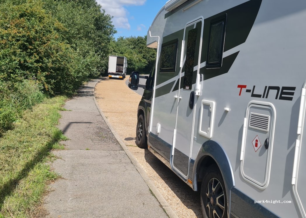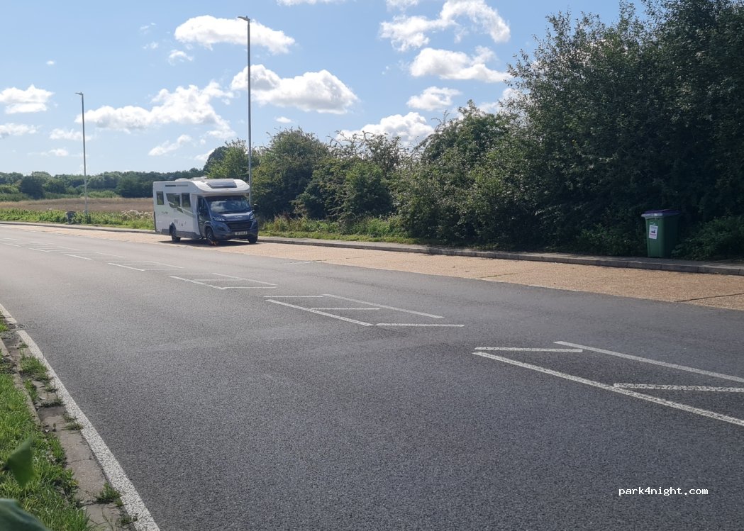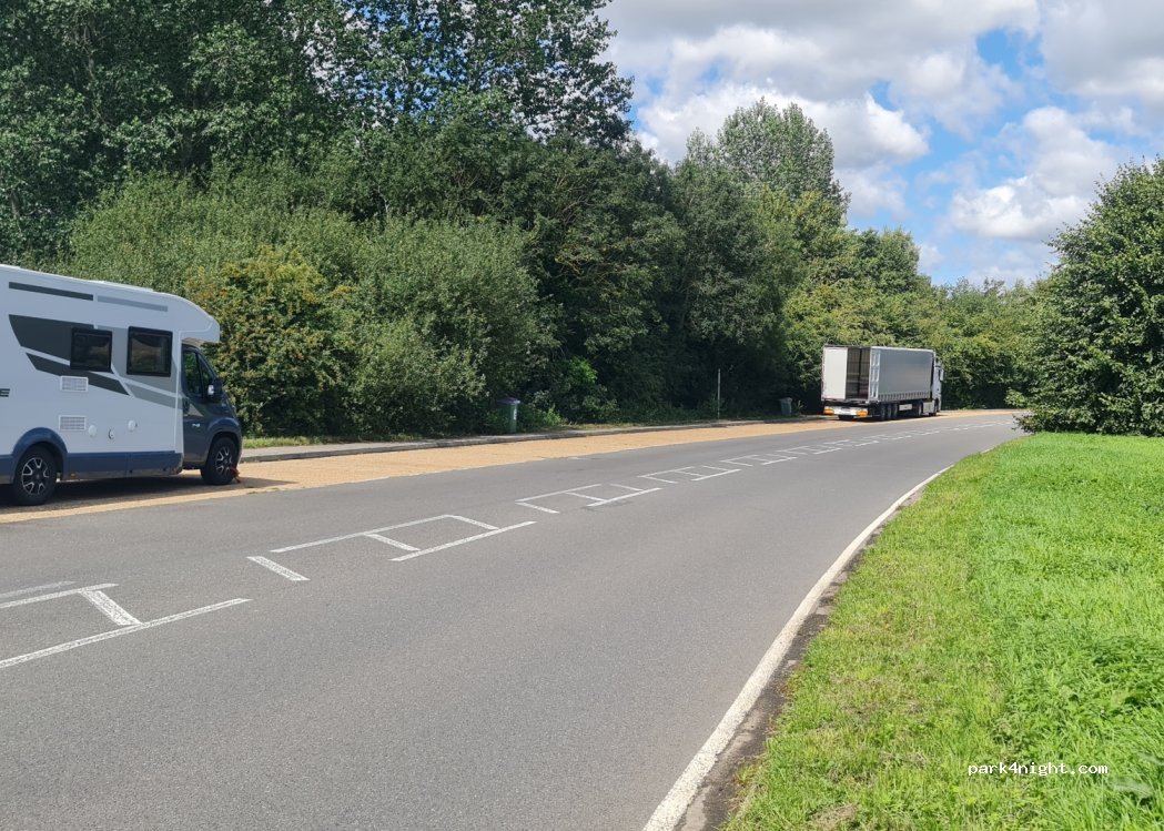 Layby right by the Airport Cafe. Used by Lorries. Free to park. Can use the Airport Cafe as a patron the next day. Bit of road noise