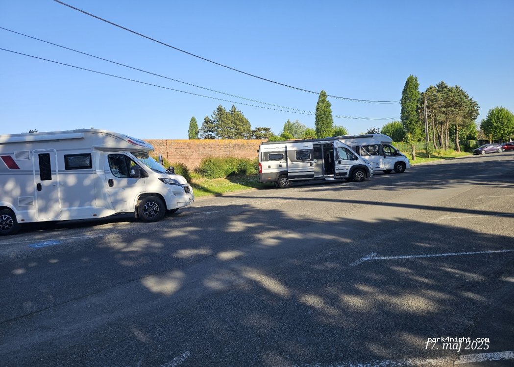 Parfait pour une nuit, bien que sur parking on est en bord d'un terrain de foot avec des arbres. Peu de passage la nuit. On a malheureusement été réveillés par une personne qui tondait les bas-côtés du stade à 7h50... dommage ! A notre départ des barrières interdisant le stationnement (avec demande d'enlèvement) ont été déposées pour la brocante du 15 Août.