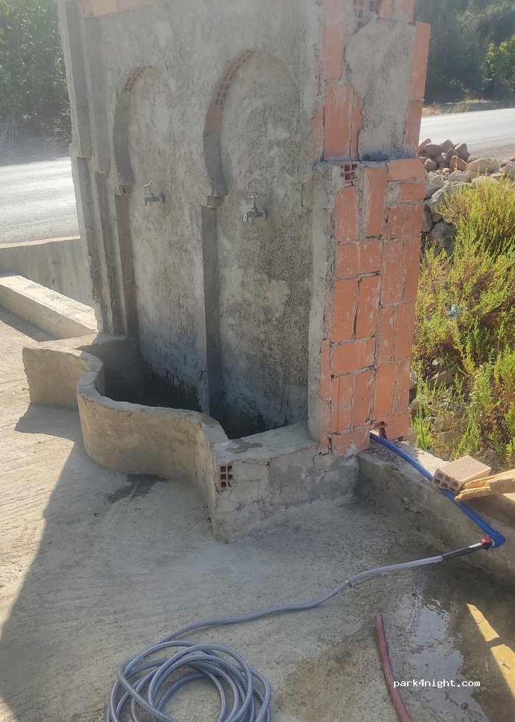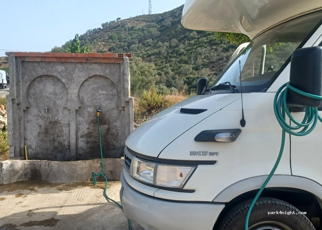 Pas de filetage mais bonne pression, grand parking plat. On a pu remplir notre réservoir de 600 litres ! Y’a des petits stands de vêtements et olives mais personne ne nous a importuné et l’eau est gratuite. Nous avons rencontré Monim, adorable, qui a des emplacements pour camping-car juste à côté « Dar Kabira Monim »