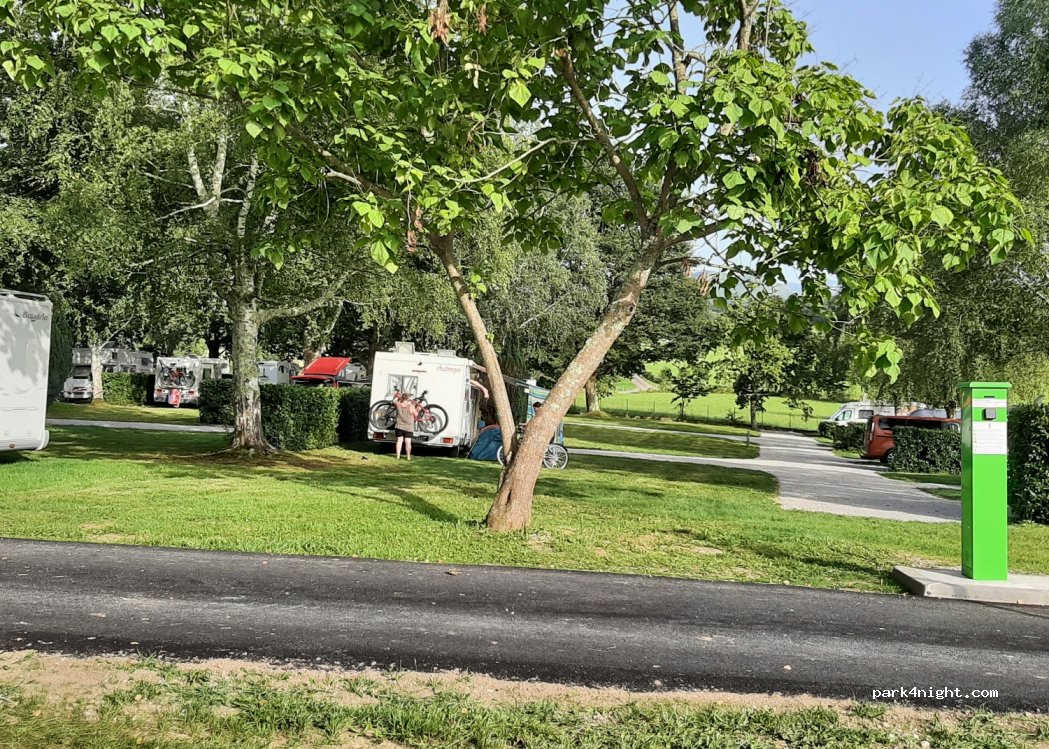 Este parque de autocaravanas es más como un camping que cualquier otra cosa. Está muy bien cuidado y se encuentra en un entorno precioso y tranquilo. La mayoría de las parcelas tienen césped y están muy bien cuidadas. Hay baños con duchas, un espacio para lavar platos y vaciar y rellenar el depósito de agua. Cámara de vigilancia. Es una zona realmente preciosa!