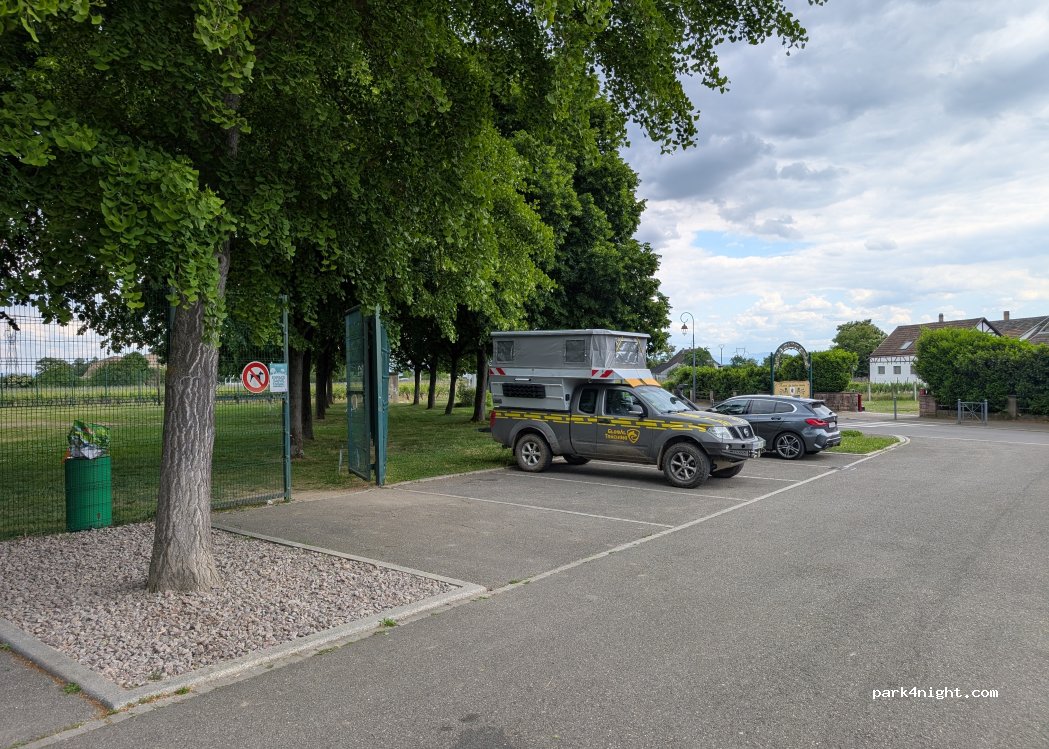 Small car park with 8 spaces up to 5 meters long, next to a children's playground, with a small area of grass outside the park next to the fence where we had lunch without any problem, very quiet and very pretty. At the exit of Colmar, and only 5 minutes from the nearby village of the castles.