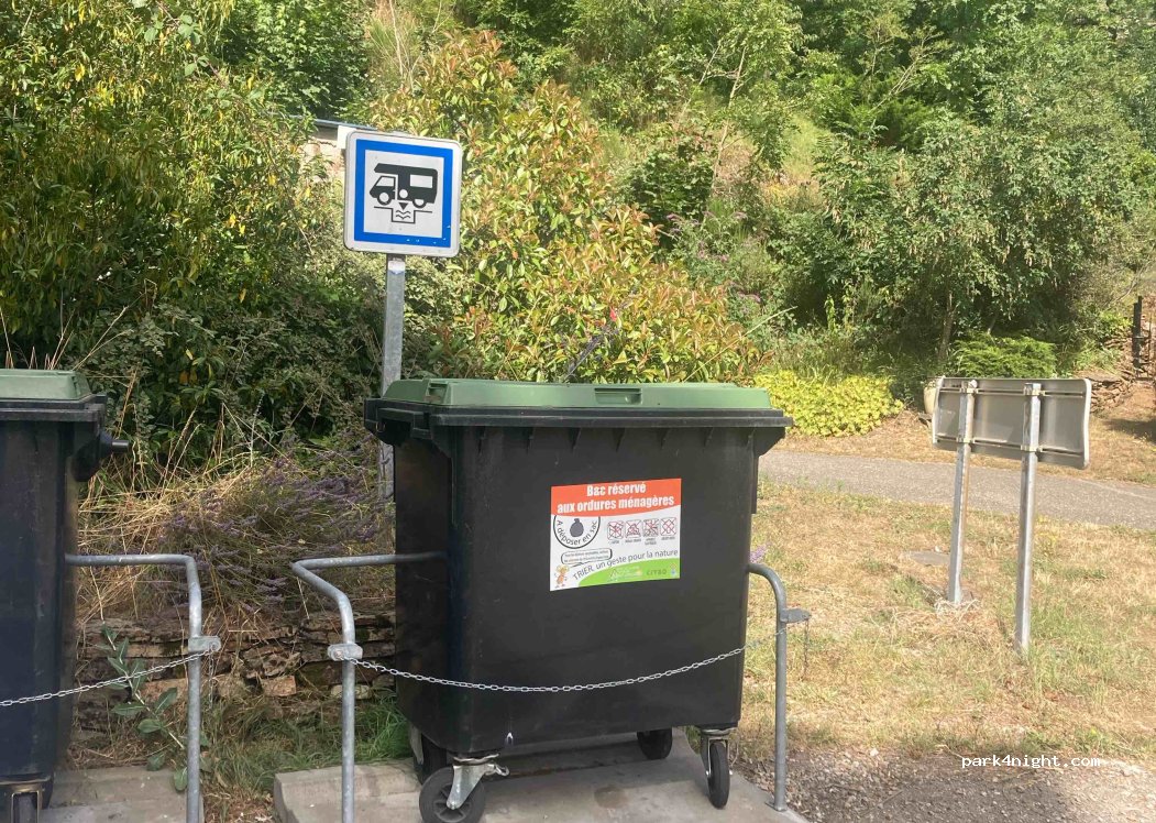 A le mérite d'exister mais pas très pratique notamment pour rincer la cassette des WC. Vidange eaux grises et eaux noires. Petit robinet d'eau à poussoir. Aire de vidange plate juste au bord de la route. Ça dépanne quand même...