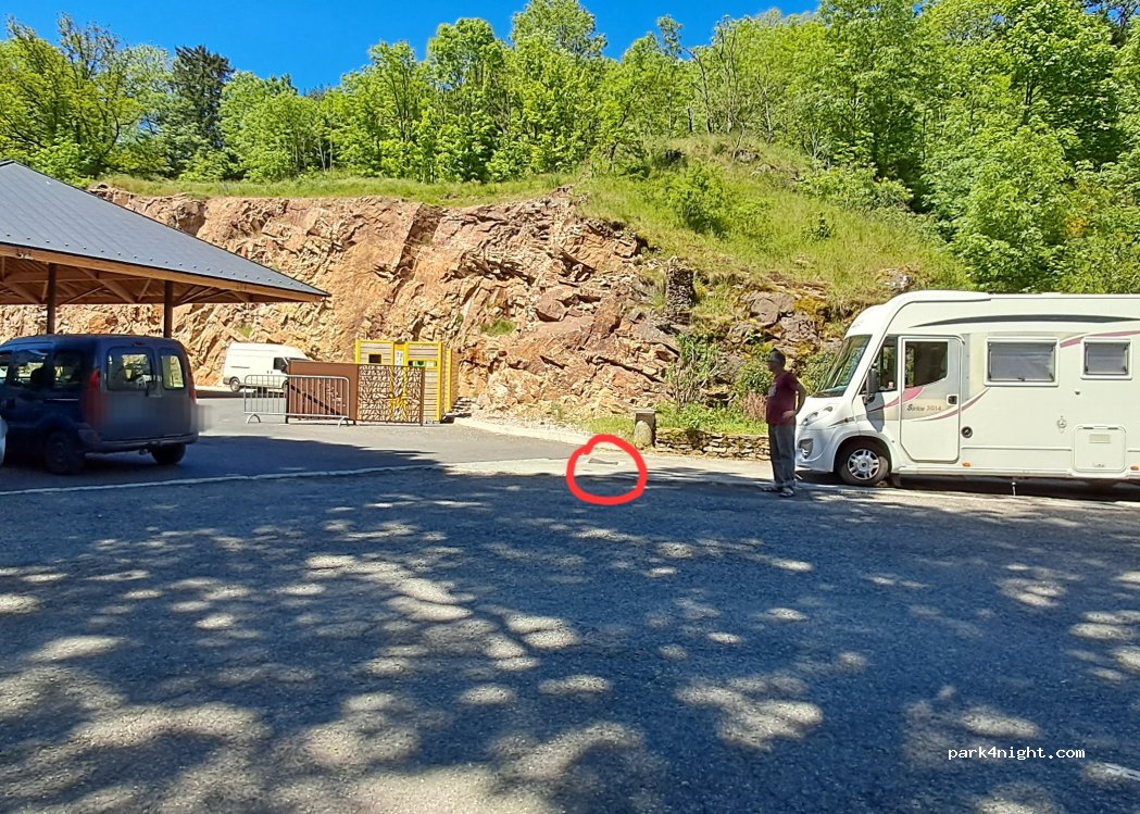 Aire de services avec vidanges eaux grises et vidange cassette WC au sol Robinet d'eau proche du sol prendre un petit arrosoir pour nettoyer la cassette Pas vu de stationnement pour les camping-cars