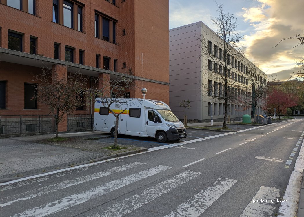Great spot close to Ondaretta and free overnight during weekends. If you park on Odarain Kalea on the buildings side of the road there is room for a van of 6m+ as the pavement is very wide so you won't impede anyone. DO NOT park in front of the red brick building though as some kind of compressor and extractor fan goes off all night.