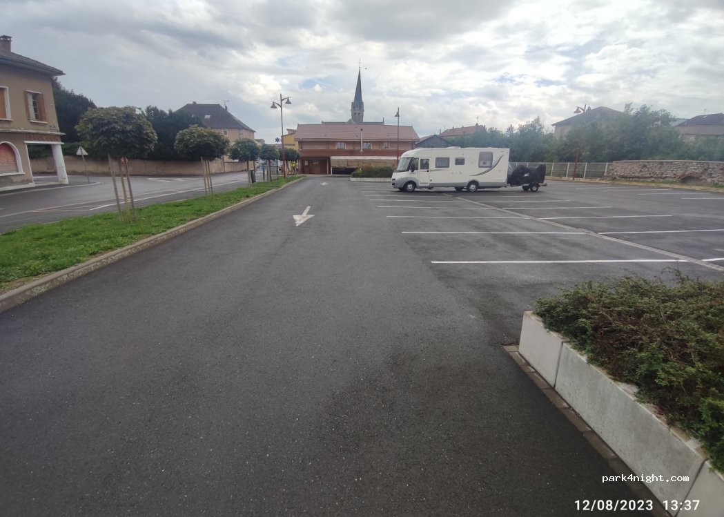Nous y sommes (septembre).Très sécurisant. Juste à côté d’une pizzeria bien tenue avec distributeur en plus. Le trafic est insignifiant. L’église proche ne sonne pas la nuit ! À côté d’un bâtiment communal. Je recommande. Actuellement, il y a beaucoup de places.