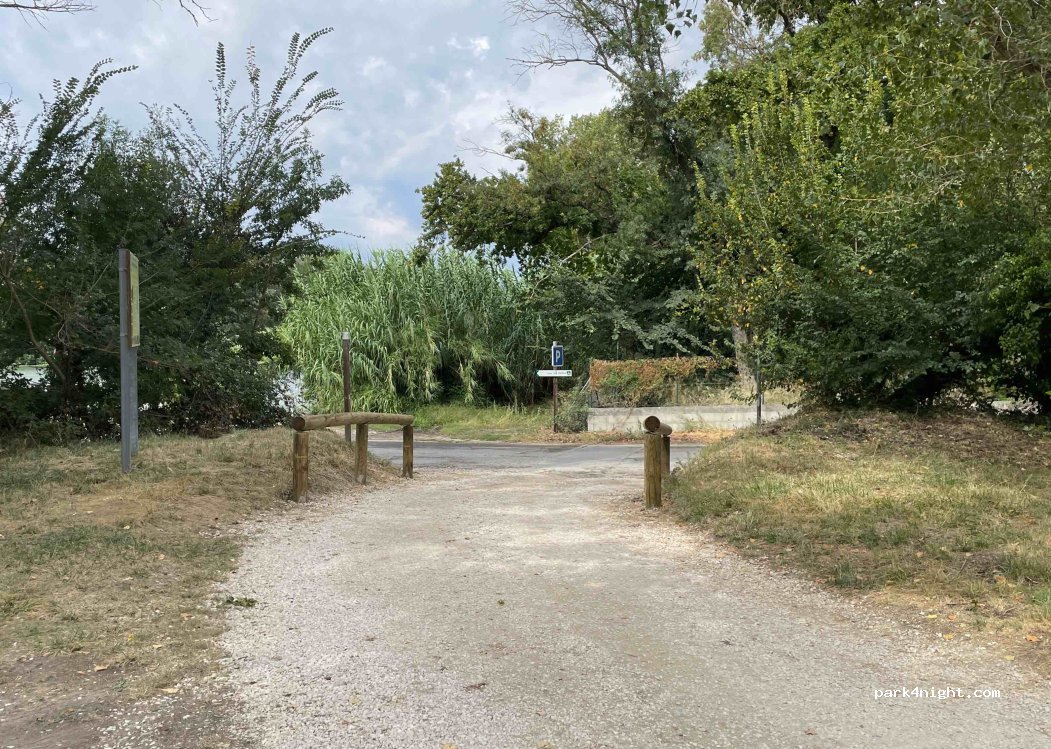 Pour accéder avec un long véhicule, traversez le pont et revenez en arrière. Vous serez mieux orientés pour accéder à ce parking idéalement situé pour rouler en vélo le long du Rhône. Aucun problème avec un CC 7m plus des vélos à l’arrière.
