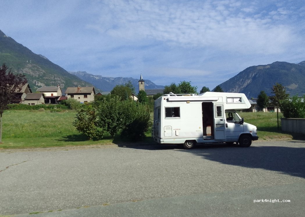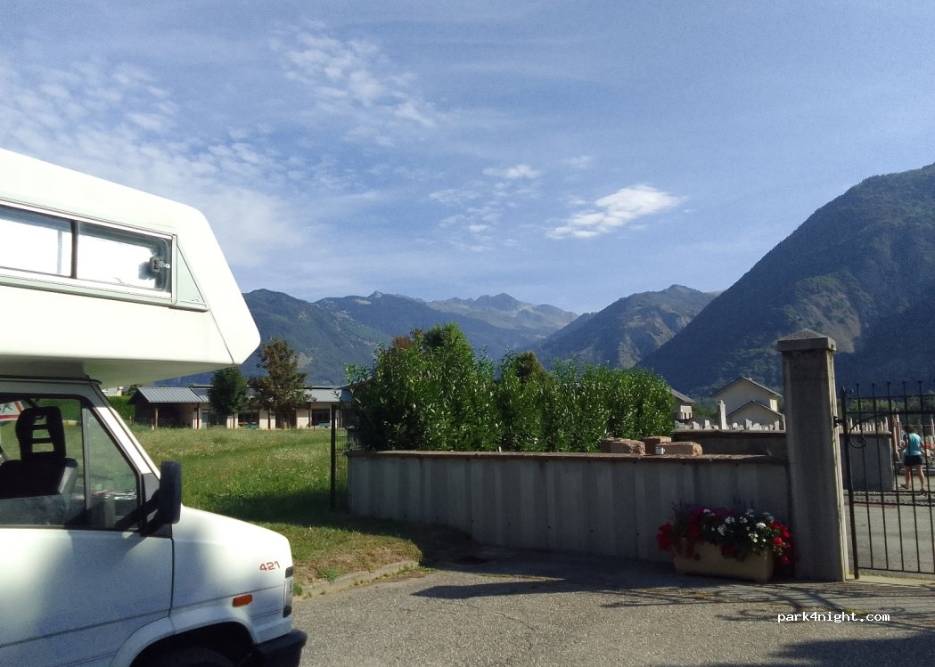 Cemetery car park 4 km from the motorway exit. Quiet to spend the day with very nice view of the mountains all around. You can hear the highway traffic very slightly. small village 200m