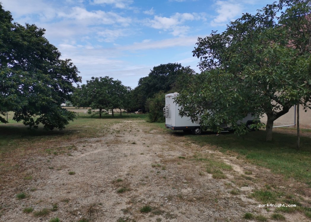 Slightly sloping car park under chestnut and walnut trees next to a meadow (cows). Call before coming, limited number of places (2) and only one night possible.