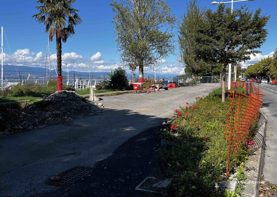 Les places sont séparés de la route par un trottoir, et sont sur le bord du lac léman.