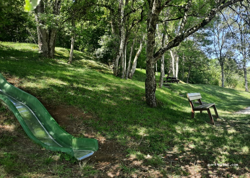 Petit point pique nique avec 1 petit toboggan, une table, 1 banc et un terrain de pétanque.