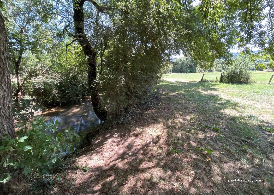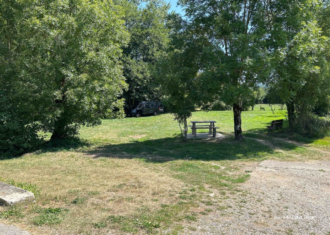 Lieu plutôt calme si ce n’est qu’on entend la nationale un peu plus loin. Nous y avons passé une nuit, l’accès est facile et l’endroit plat (nous avons un van aménagé). Je pense qu’il est important de se garer sur le replat bien visible au niveau du banc côté rivière au risque de s’embourber (il n’a pas plu mais les nuits semblent très humides). L’accès à la rivière est difficile et l’eau était, à ce jour, non baignable.