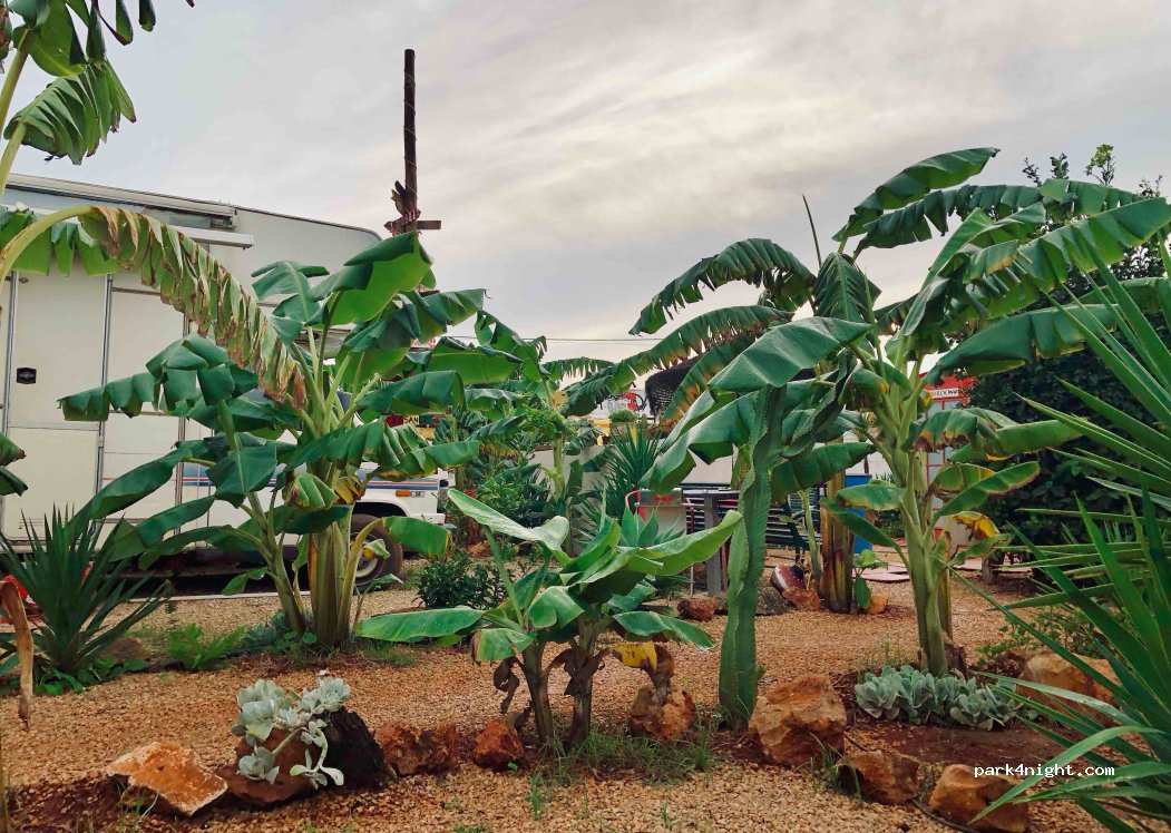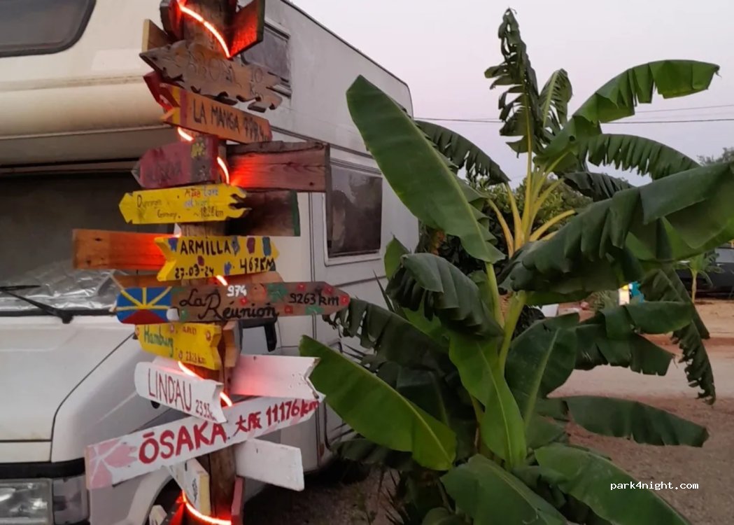 Aire effectivement que l'on trouve nulle part ailleurs, avec ses emplacements délimiter par les palmiers, bananiers en plus de la déco très particulière, pour les amoureux de voitures anciennes, Moto, machines à coudre.. etc. une aire de jeu pour les enfants. Accueil de l'hôte Christina avec des oranges de sa production. Bref ...! endroit qui donne envie d'y retourner. JLG