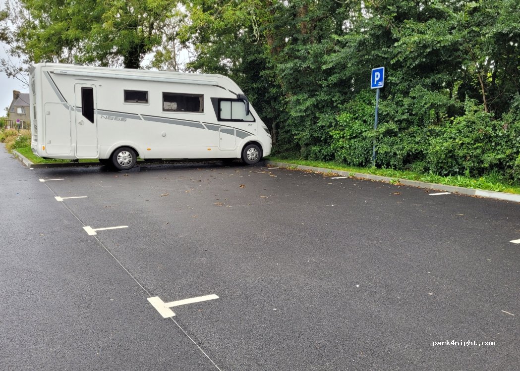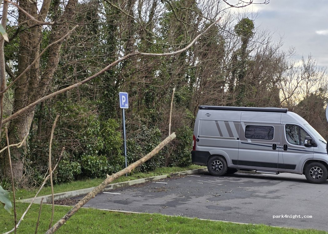4 camper van spaces located at the top of the car park on the right. Sloping.