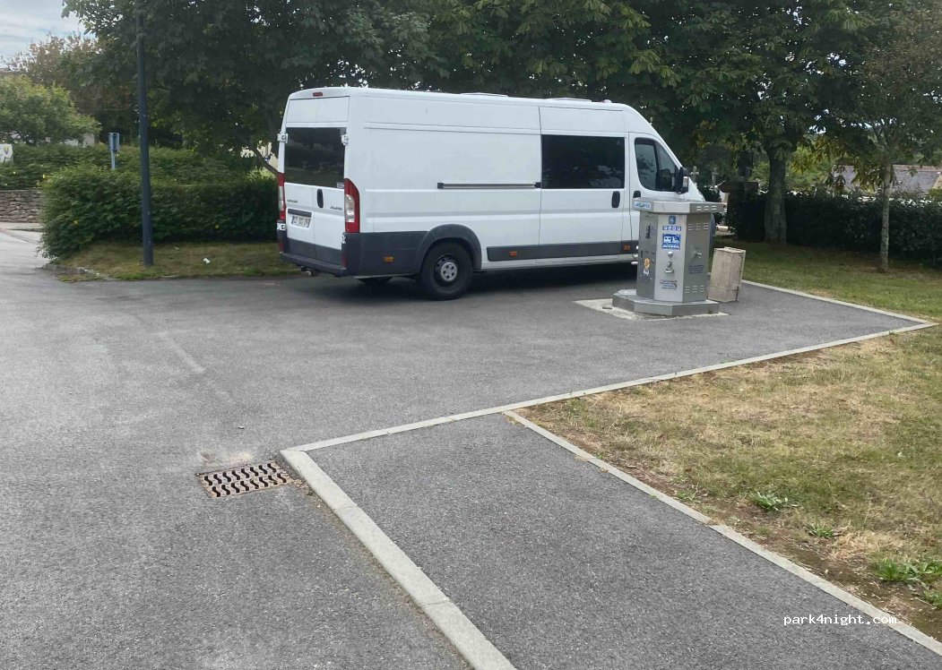 bonjour, 4 places de parking un peu léger, on été 9 camping car. bon c'est un grand parking donc on peu ce gérer. parking en pente prévoir cales. du passage entre bus scolaires, camion, voiture. il y a des poubelles, WC, vidange eau grise ,WC,eau 2 euros. merci a la mairie.