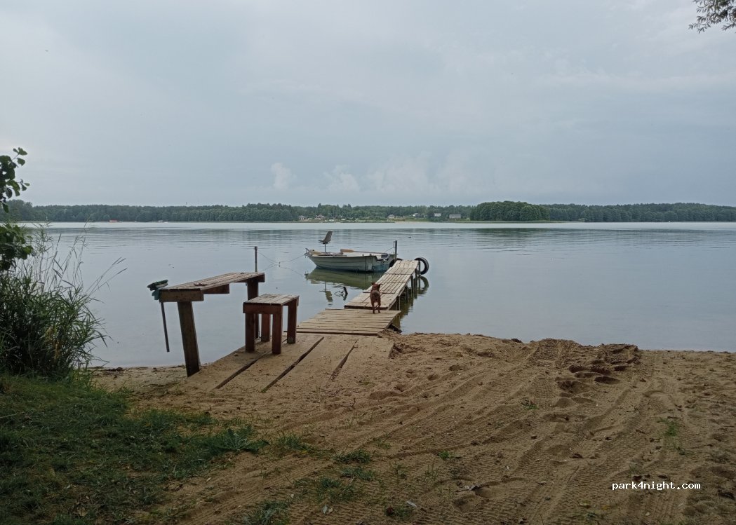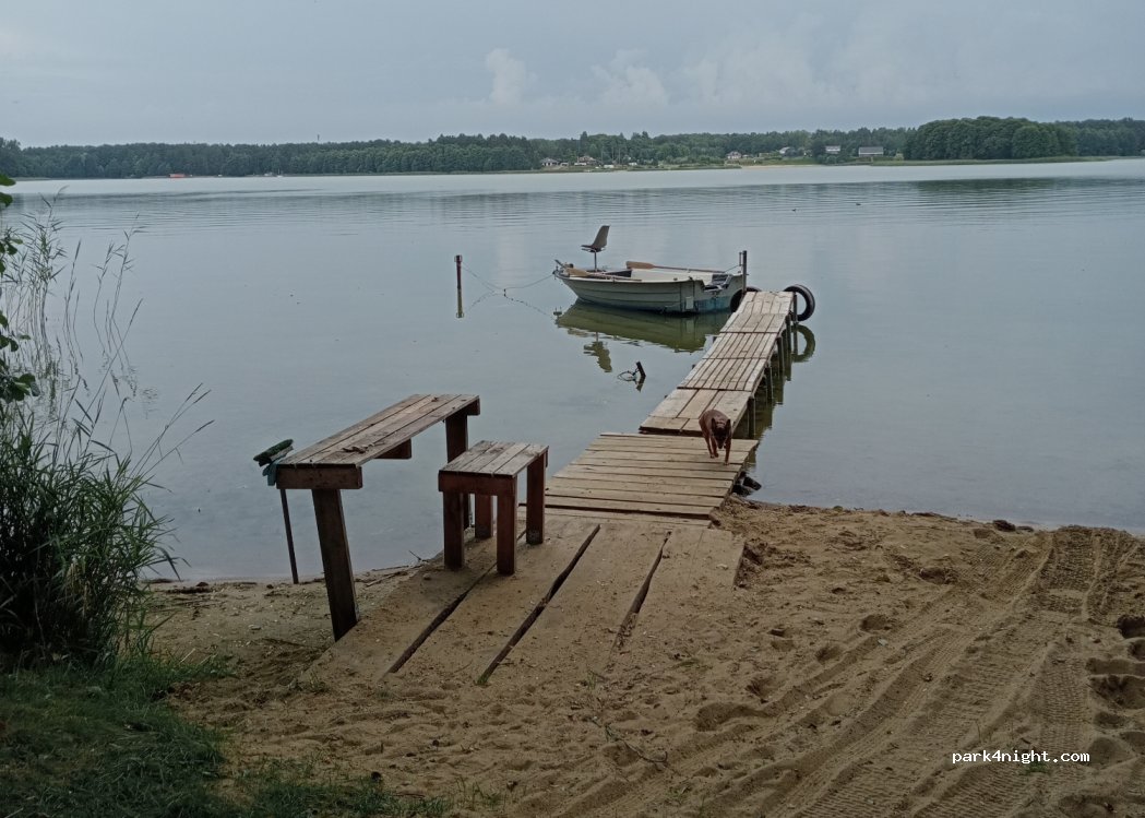 Beautiful place hidden in the greenery. Right next to the lake. I spent the night with the VW T5 motorhome. Very calm. A neighbor came to greet us. It is not private property. There are also semi-circular benches around the fire to relax. Small table near the pier. Very idyllic location.